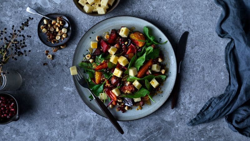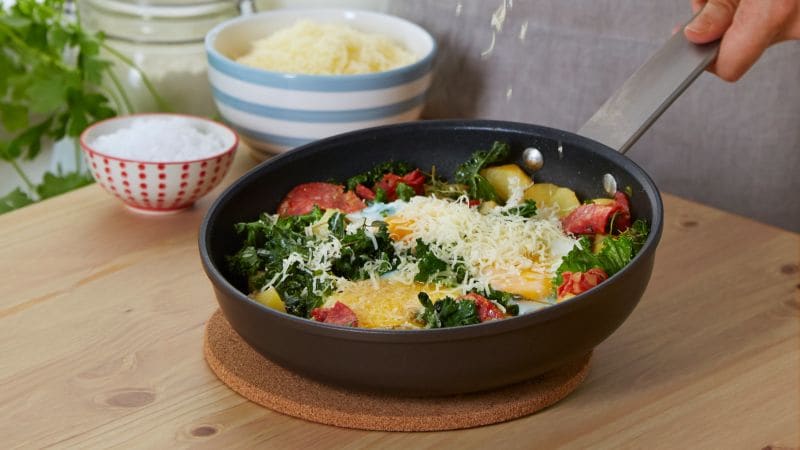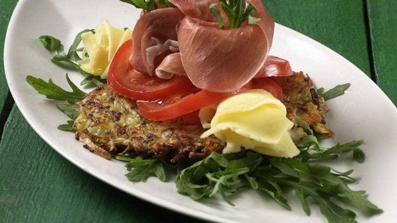 Røstipoteter kommer opprinnelig fra Sveits og passer veldig godt som tilbehør til både kjøtt og fisk. Men det kan også serveres som egen smårett, som her med spekeskinke, Jarlsberg® og ruccolasalat.