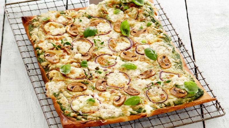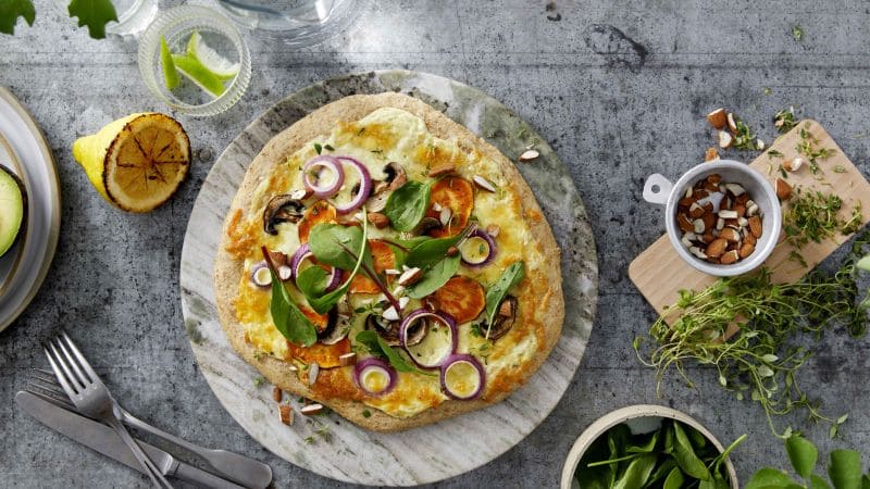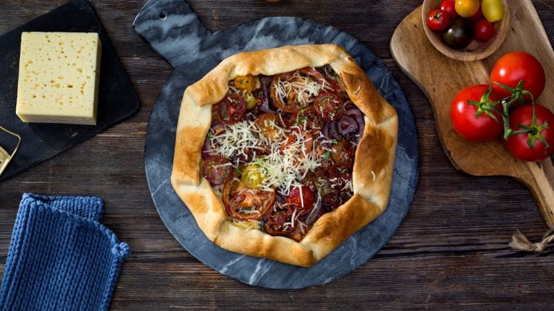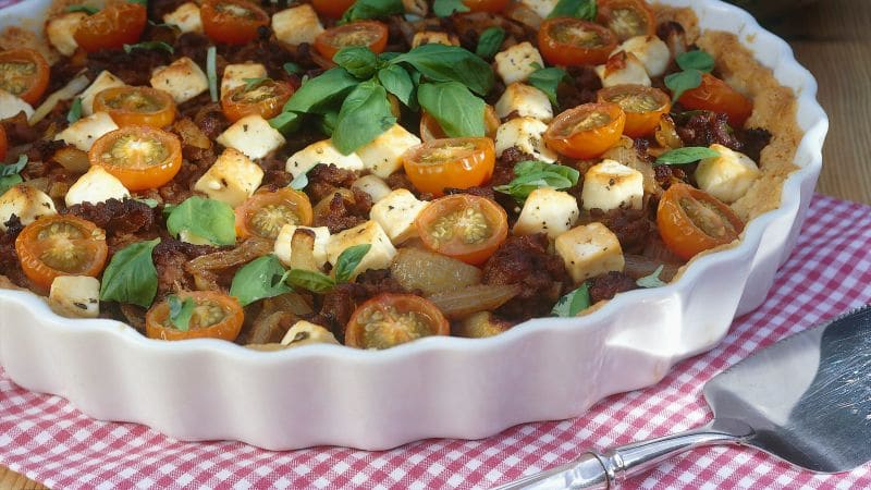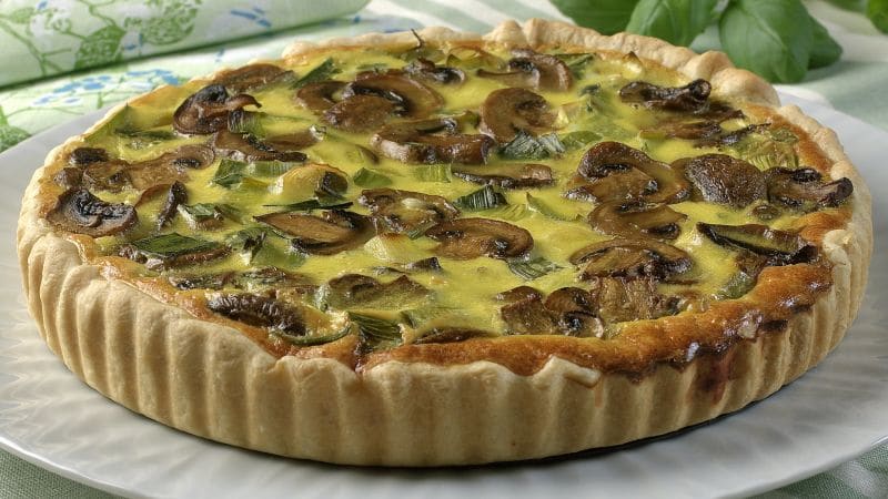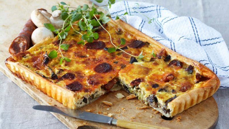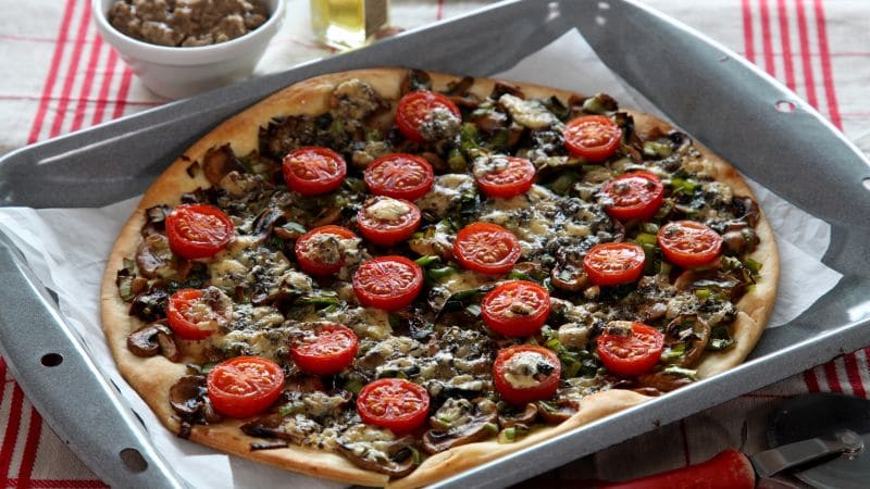 Pizza og pai er begge populære retter og i denne oppskriften får du det beste fra to verdener! Toppet med sopp, cherrytomater, purre, blåmuggost og en tapenade laget av blant annet champignon og hvitløk, får du en smakfull middag enten til hverdags eller til lørdagskosen. Pizzapaien er vegetar.