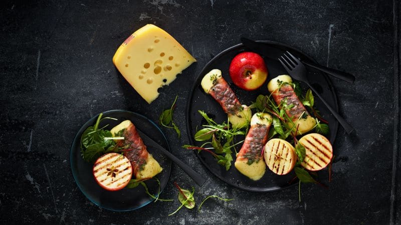 En herlig liten grillgodbit som du kan serveres som snacks, forrett eller som del av et grillmåltid. Biter av Jarlsberg® surret i italiensk skinke servert med ruccola eller urter.