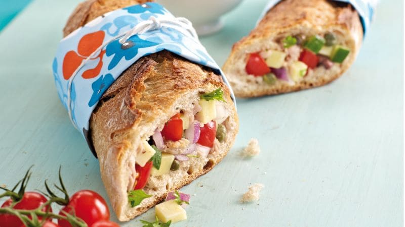 Pan Bagnat har sin opprinnelse i Nice, ofte fylt med Salat Nicoise. Her er en ny vri, grove rundstykker med Norvegia, kremost, okserull og grønt eller kanskje du liker tunfisksalat bedre?