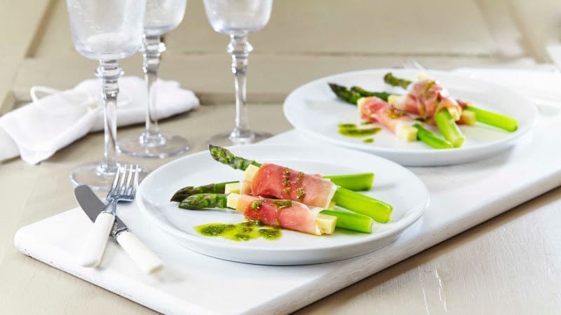 Lettkokt asparges med en skive Ridder® og spekeskinke surret rundt er en virkelig apetittvekker og passer godt i tapas, en snack eller som en liten forrett.