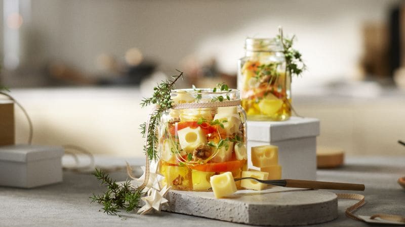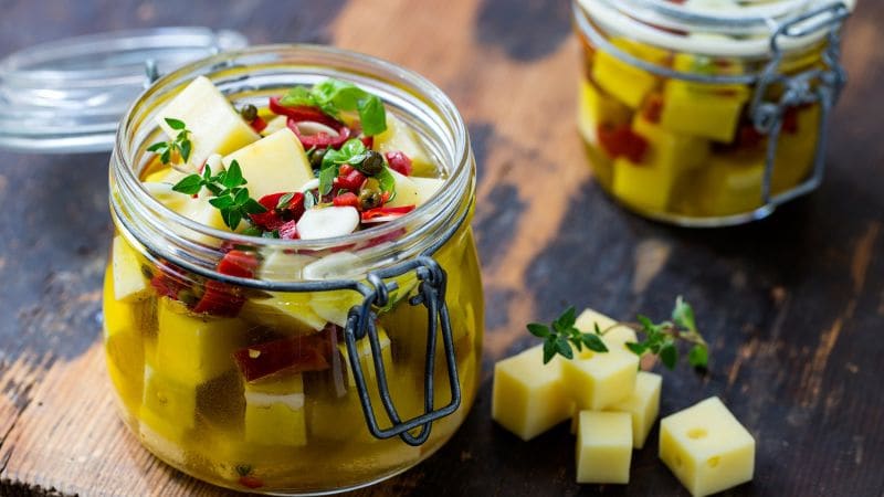 Marinert ost med ferske urter og hvitløk. Perfekt å bruke i en salat eller spise den som den er. Marinaden bør trekke minst et par dager før servering for å få mest mulig ut av smaken.