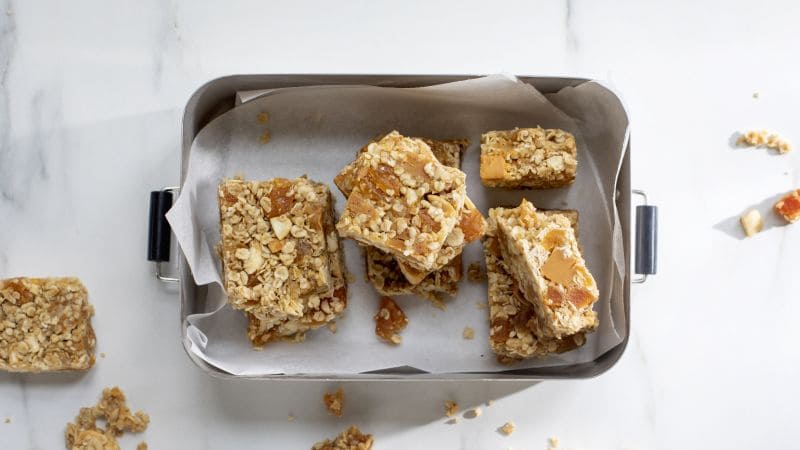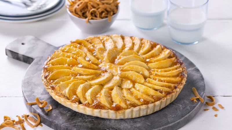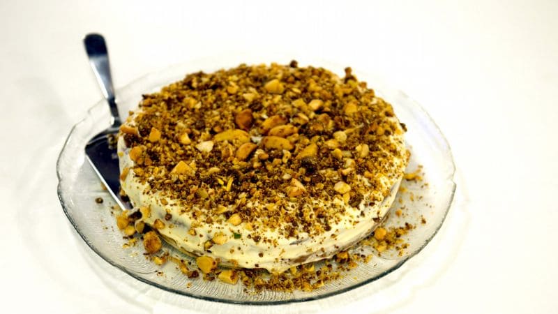 Bakt epleostekake på havrebunn med karamelliserte nøtter
