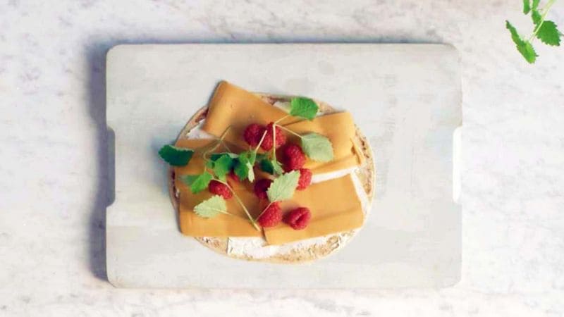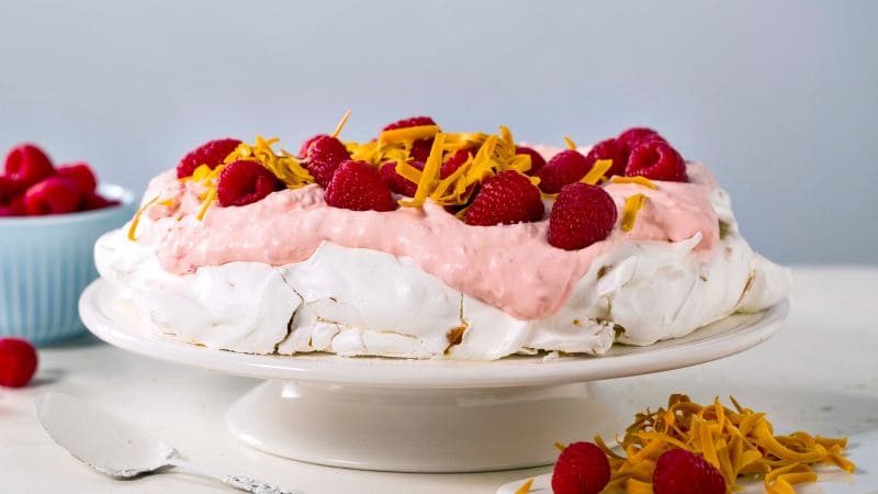 Brunost i marengsbunnen gir en herlig karamellsmak som smaker deilig til syrlige bringebær. Gjenta smakskombinasjonen som pynt og du har en helt spesiell pavlova til en helt spesiell anledning.
