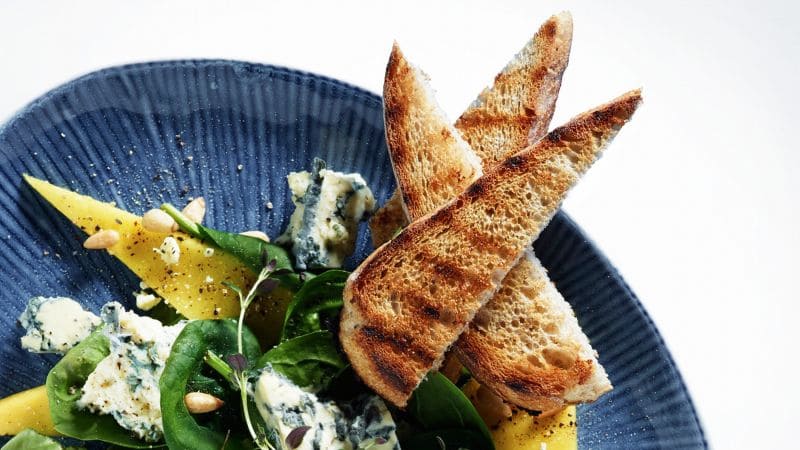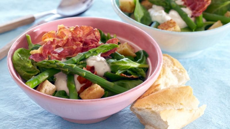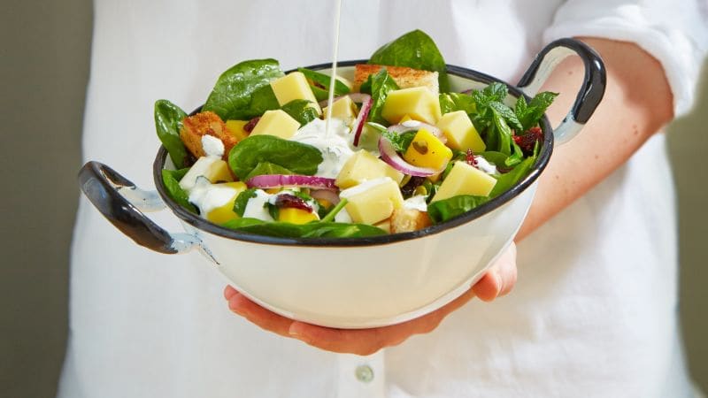 Dette er salaten for en ekstra god hverdag eller helg, en nydelig spinatsalat proppfull av ost, friske smaker, store krutonger, servert med myntedressing.