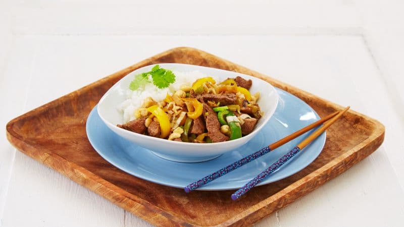 Wok er rask og god hverdagsmiddag. I denne oppskriften finner du godsaker som oksefilet, østerssopp, paprika, purre, stangselleri, hvitløk, ingefær og cashewnøtter.