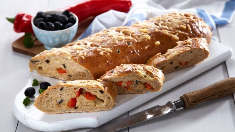 Dette en oppskrift på et fantastisk saftig og smaksrikt brød. Fyll brødet med paprika, ost og oliven. Brødet passer perfekt til suppe. For å få til et godt resultat bør du elte deigen lenge. Denne oppskriften gir to brød. Brødene egner seg for frysing.