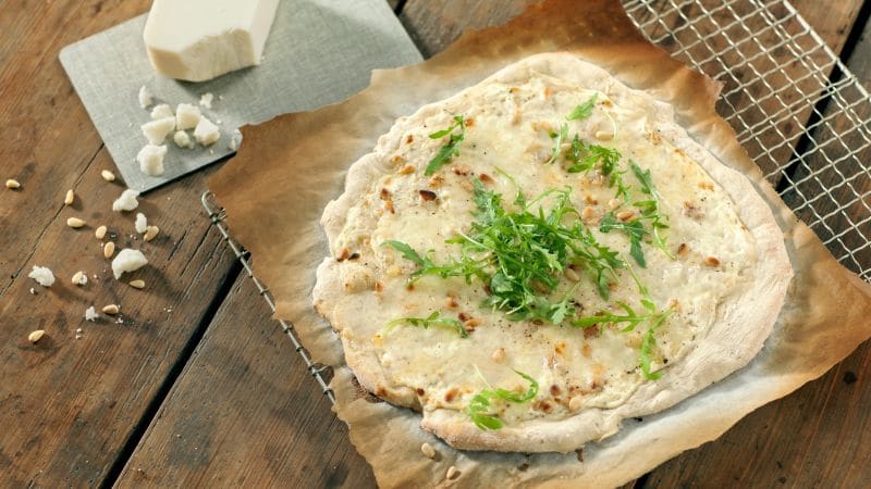 Dette er en «pizza bianca» uten tomat, der den friske smaken av hvit geitost kommer tydelig fram. Den litt syrlige smaken på osten balanseres med honningens sødme, knasende ristede pinjekjerner og fersk ruccola setter prikken over i`en. Oppskriften gir en italiensk pizza med tynn og sprø bunn, uten bruk av pizzaovn, pizzastein eller andre hjelpemidler.