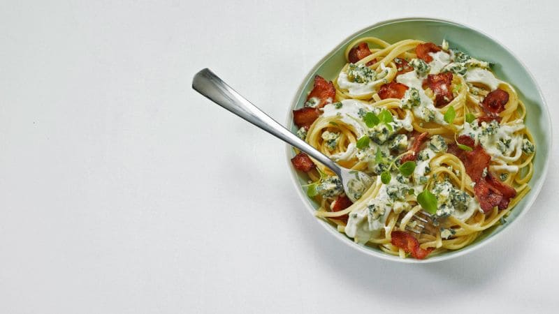Pasta med blåmuggsaus og bacon. Dette er en enkel hverdagsrett som smaker fantastisk. Litt Norzola i hverdagssausen gjør pastamåltidet mer smakfull og du blir helten på kjøkkenet.