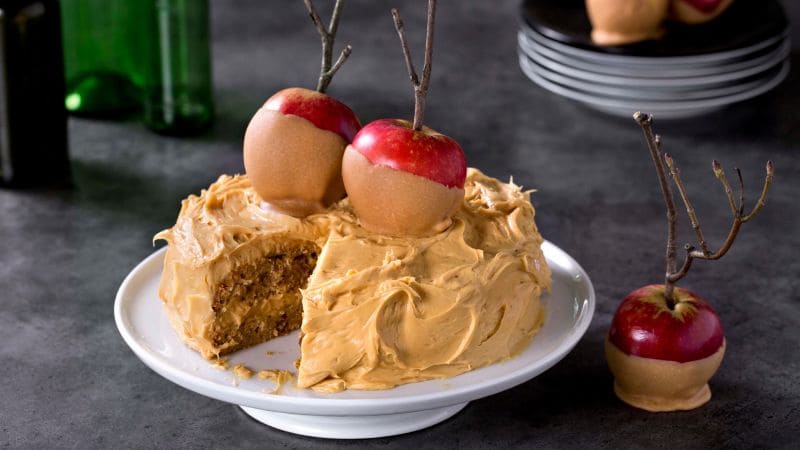 En saftig eplekake med fløyelsmyk brunostkrem gir mye kos i høstmørket. Toppet med fløtekaramelliserte epler blir den både litt skummelt og eventyraktig og perfekt til Halloween-festen.