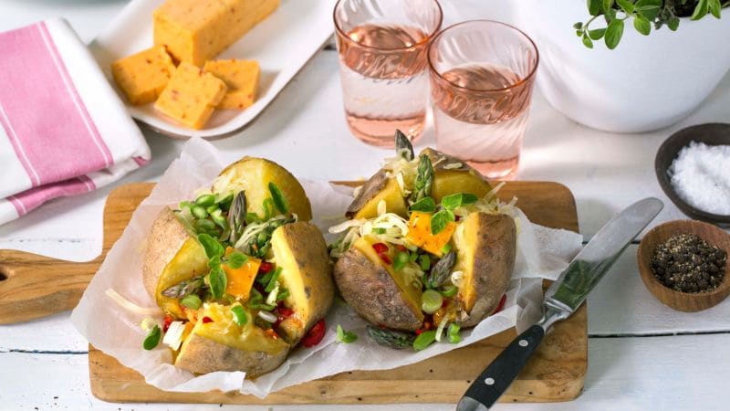 Bakt potet med smør er godt som tilbehør til grillmaten, men topper du den med asparges, ost og digg grillsmør med chili og hvitløk blir det garantert sommerens hit!