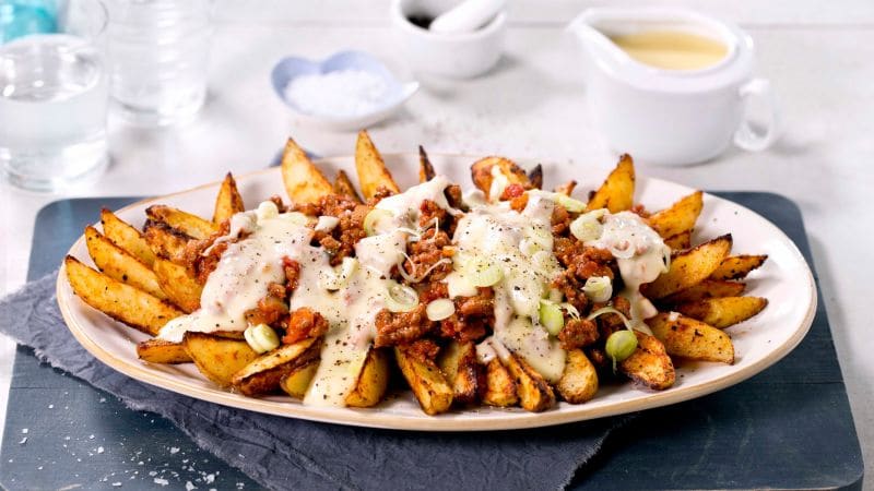 En skikkelig amerikansk snack. Dette er kosemat som fungerer som et helt måltid. Pommes frites dynket med spicy chili kjøttsaus og ostesaus. Blir det bedre?