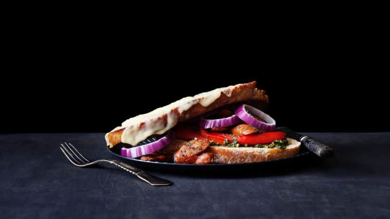 Et ostesmørbrød med smak av Middelhavet. Med den pikante chorizopølsen, grillet paprika, løkringer og fyldig ost er dette et ostesmørbrød som passer perfekt for deg som lengter etter sommerferien. Oppskrift innsendt av Markus Løvdal.