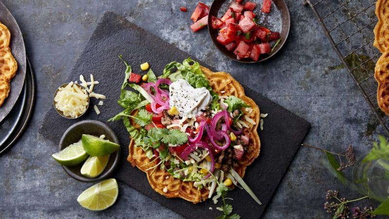 Taco er alltid populært. Overrask med vaffel istedenfor tortilla og du har en snakkis rundt middagsbordet. Denne vaffelen har både ost og tacokrydder i røra. Veldig, veldig godt!